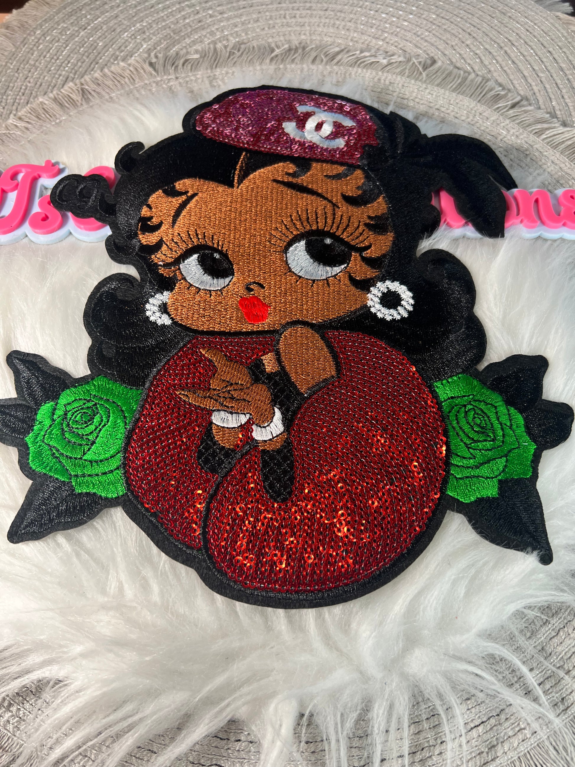 This stunning Diva Patch features a fierce beauty sitting in shimmering red sequins with emerald green rose details β€” pure luxury meets attitude!