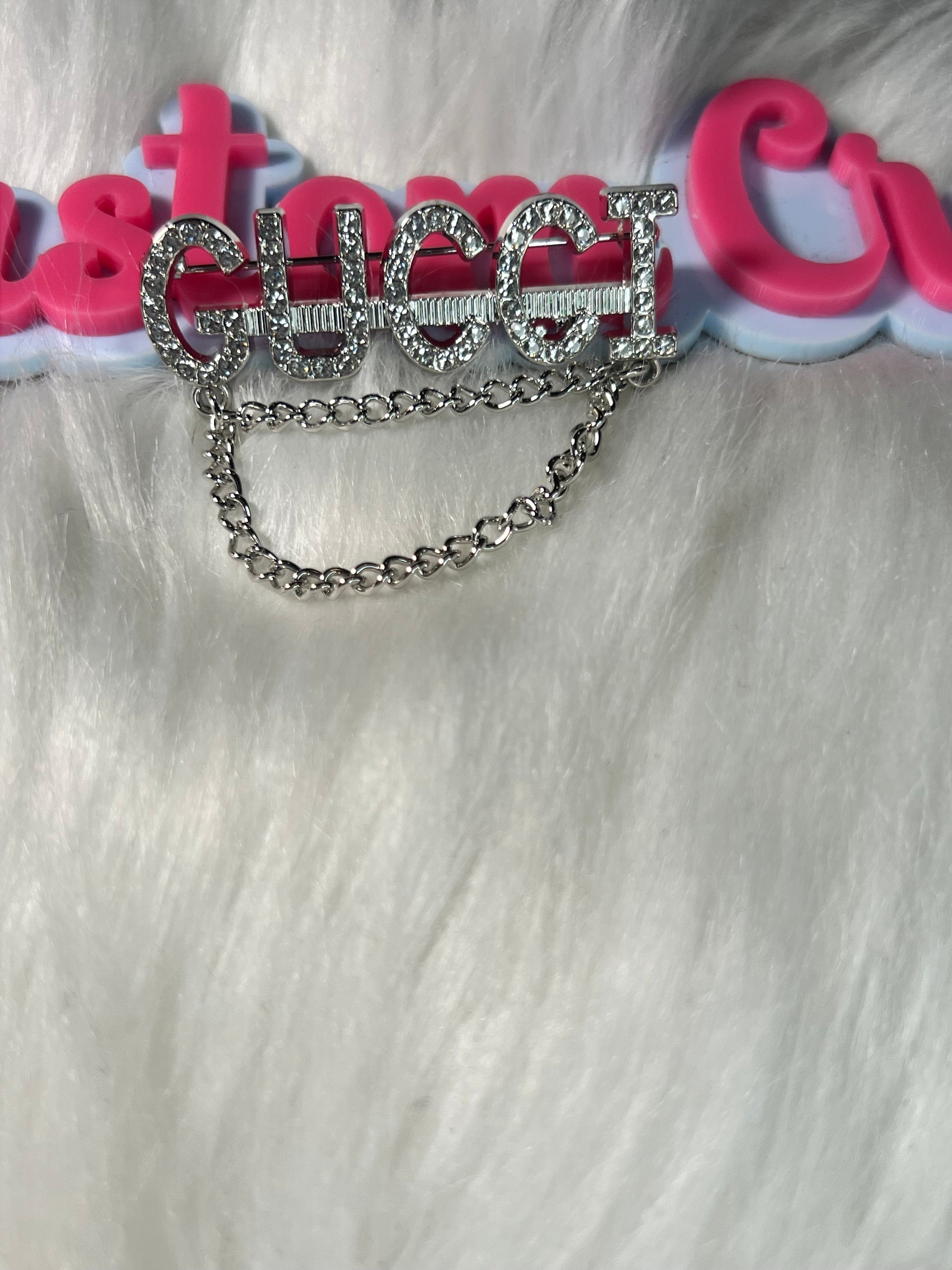 Double-chain detail meets blingy letters — this silver rhinestone “GUCCI” brooch is pure showstopper energy. Add it to your jackets or bags for high-fashion sparkle.