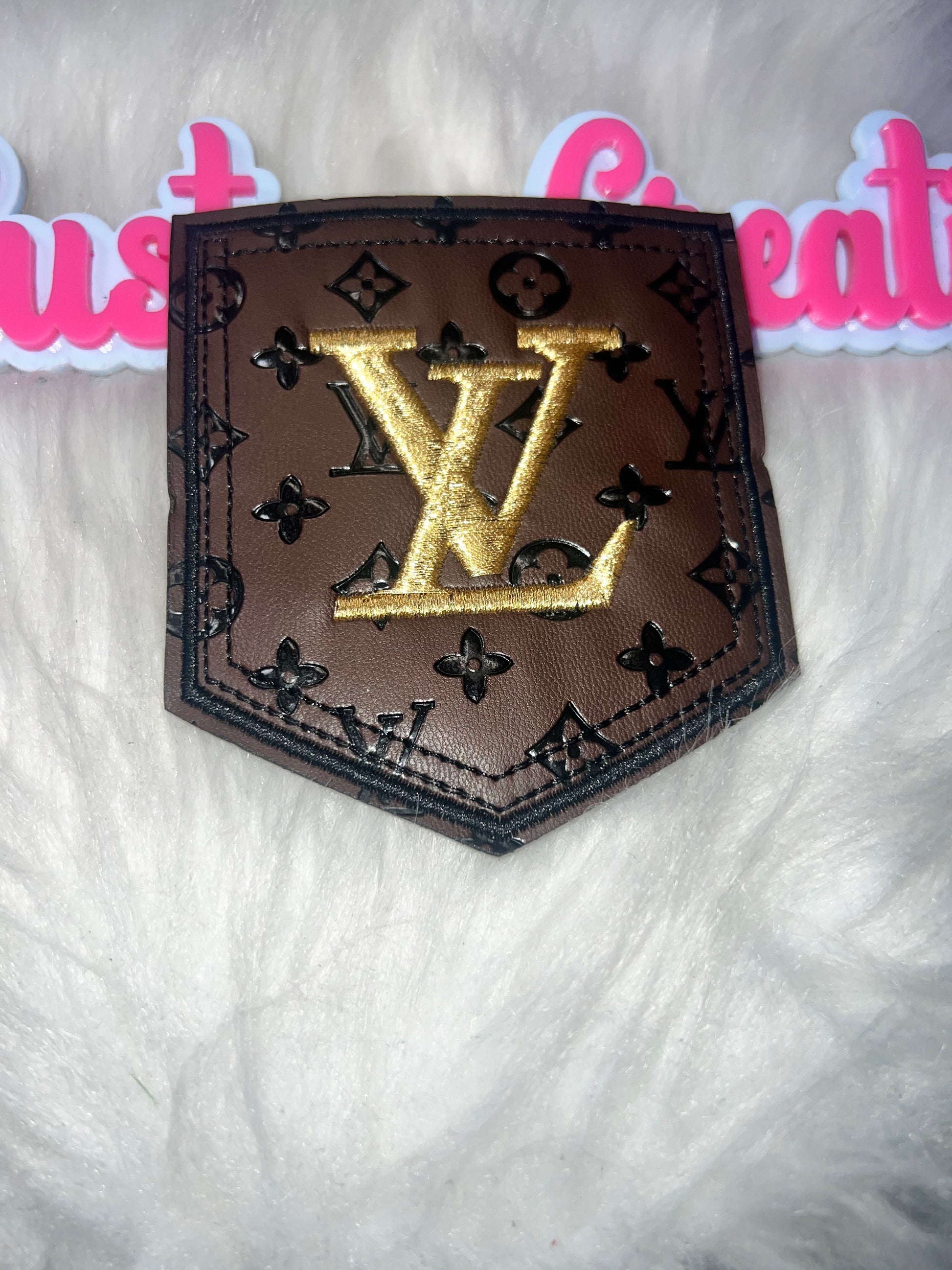 Elegant pocket patch featuring a deep brown leather-look background with bold gold embroidery and subtle patterned accents. The rich color combination creates a luxe fashion-forward look perfect for statement customization.