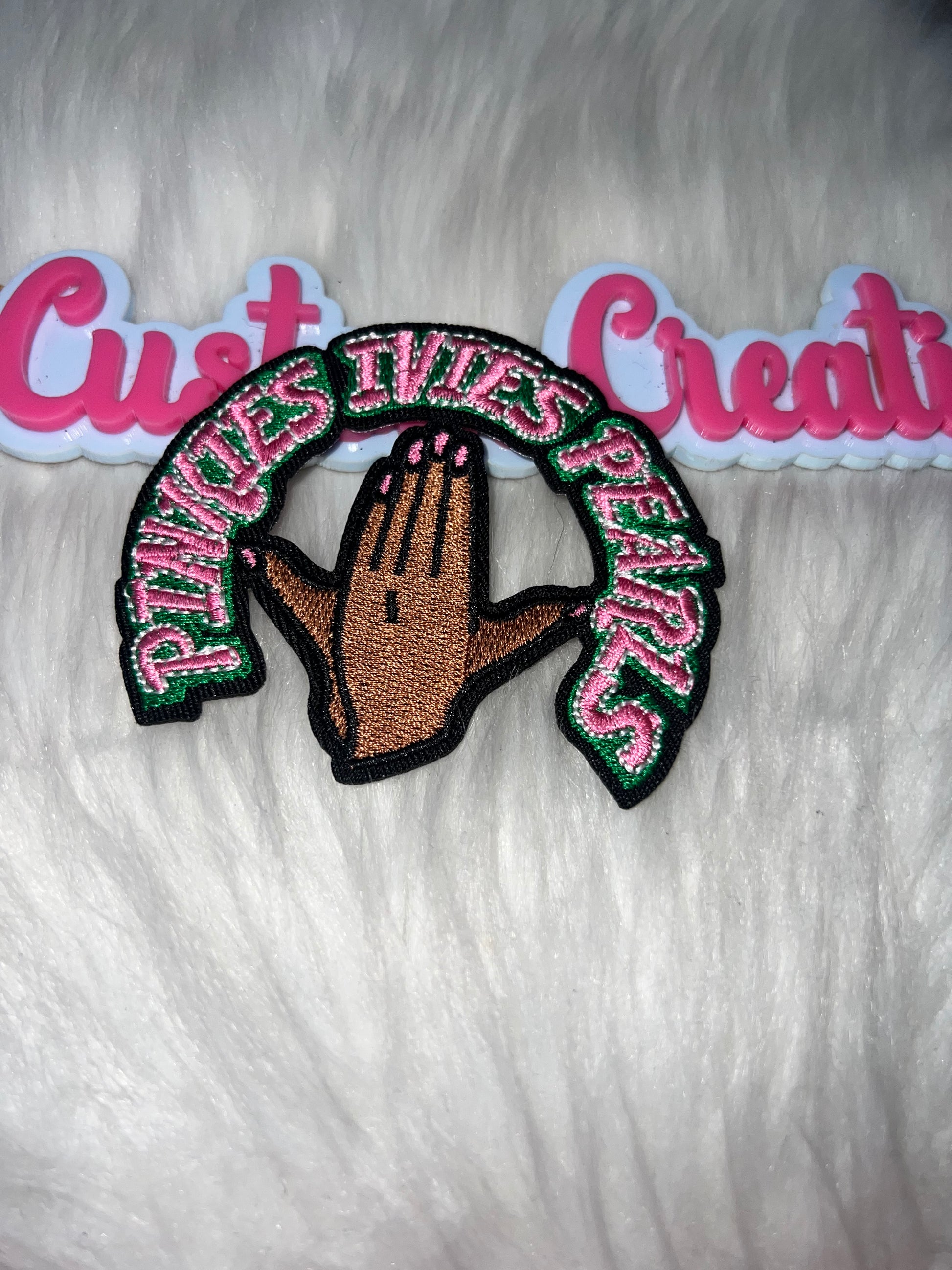 Make a powerful statement with this Business Over Peanuts AKA patch. Featuring praying hands and bold lettering in pink and green, this patch is perfect for jackets, totes, and empowerment pieces.