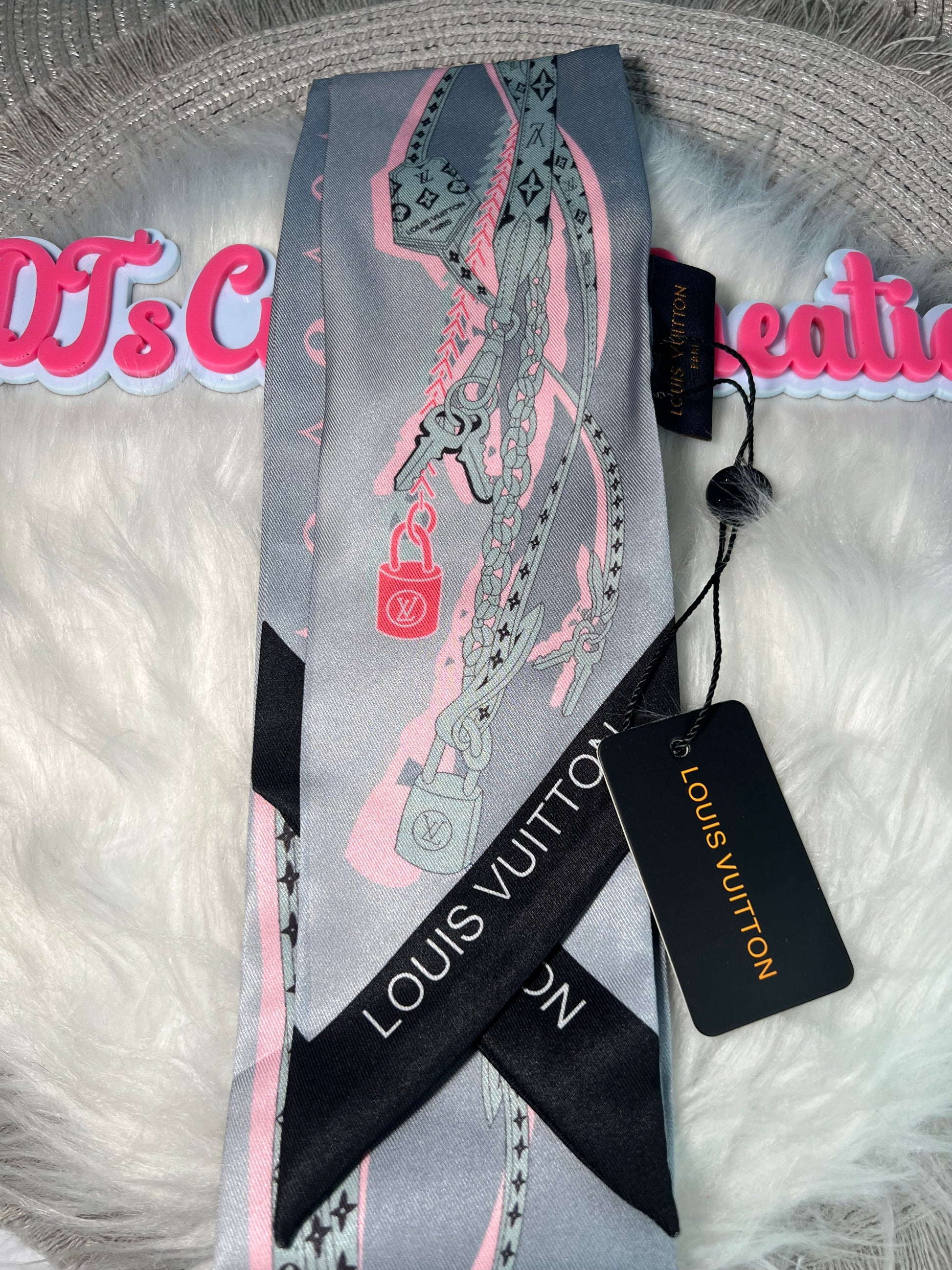 Edgy elegance done right! This gray and blush pink LV-inspired scarf features chain and key illustrations for a sleek designer look. Perfect for creating polished and modern outfits with a touch of glam.