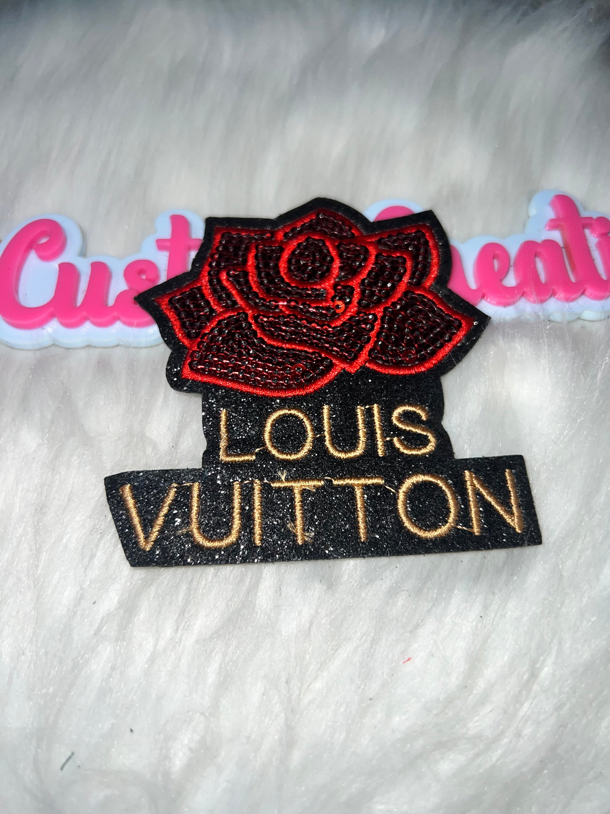 Luxury meets floral glam with this LV-inspired rose patch. Features a bold red beaded rose and embroidered lettering—perfect for statement pieces.