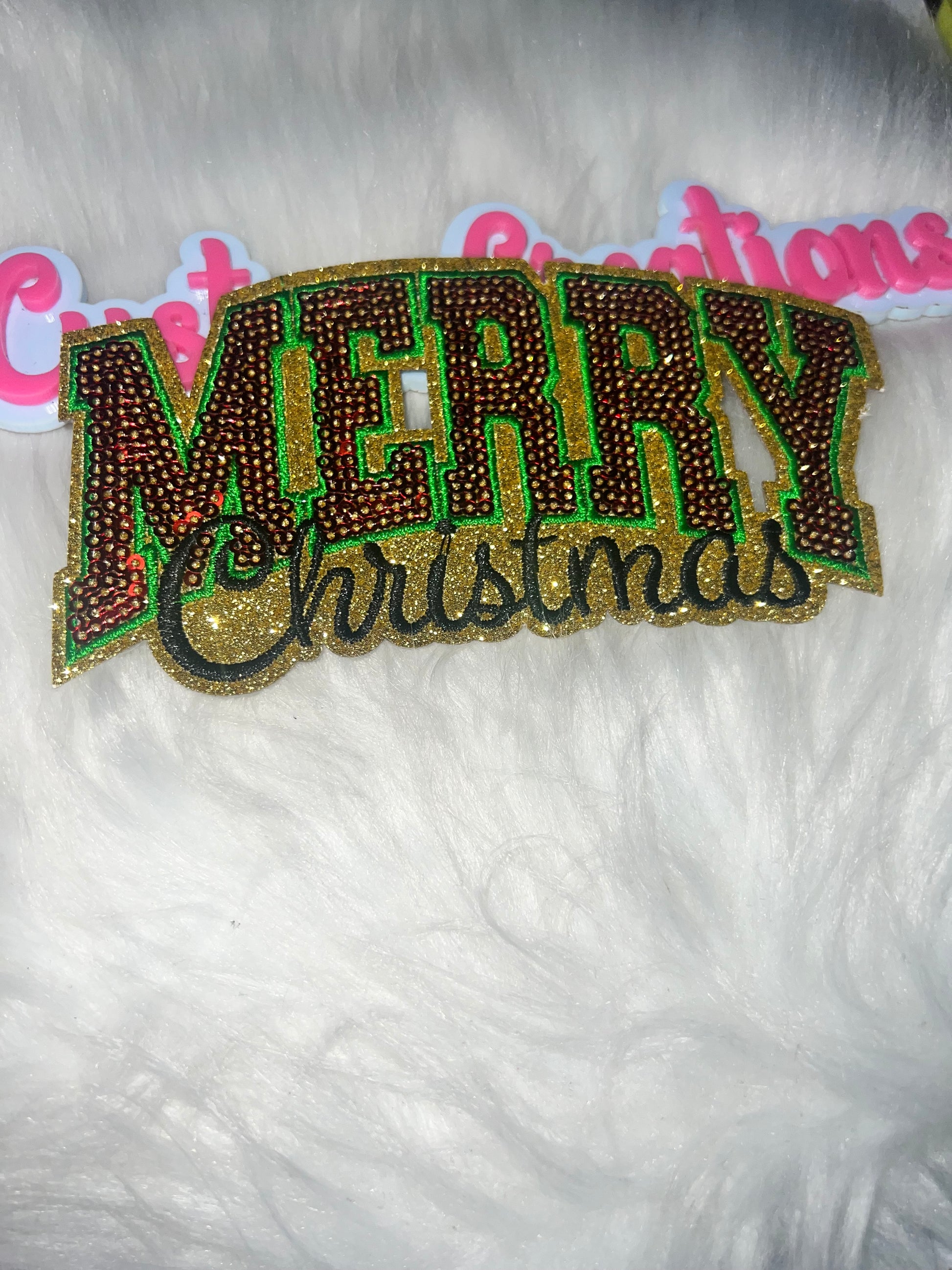 Large glittery embroidered holiday patch in gold, green & red. Perfect for sweaters, totes & holiday décor.