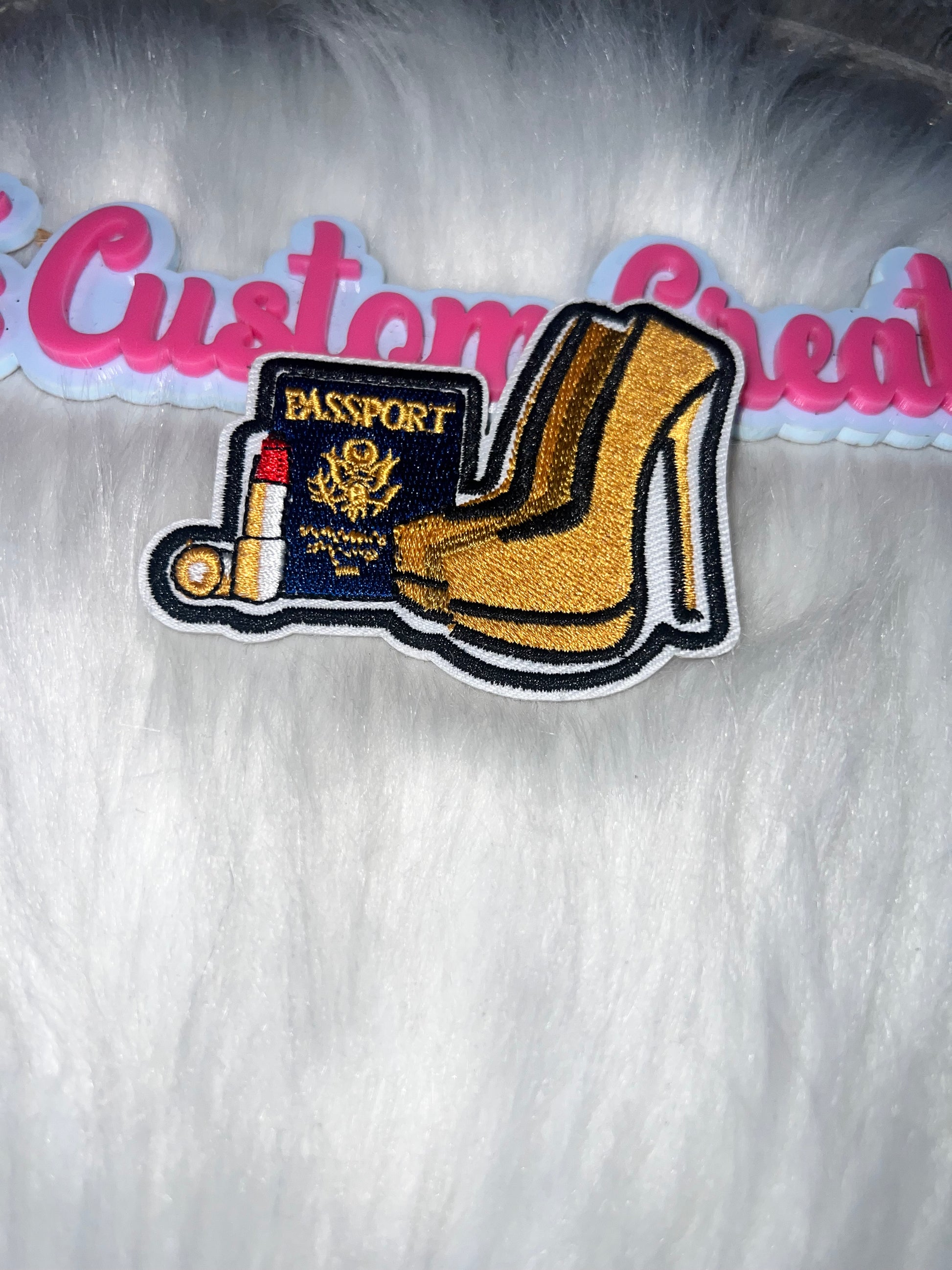 Passport & Heels Patch – Gold Shoes + Passport + Lipstick
