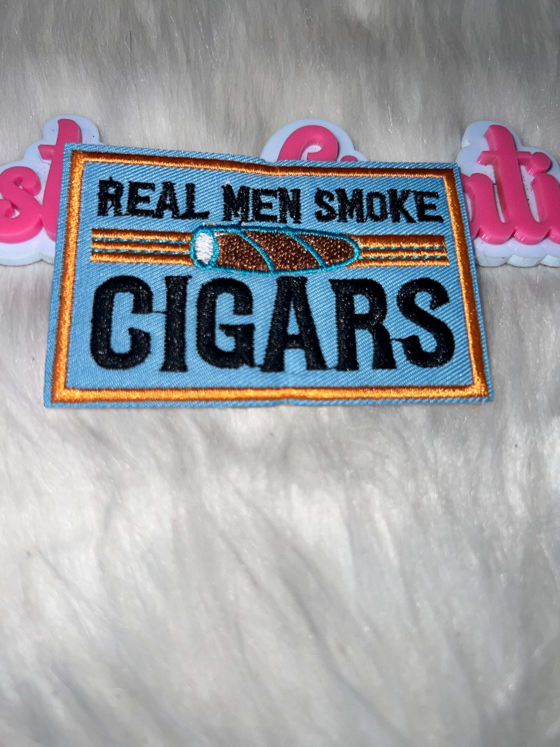 Statement rectangular patch that reads “Real Men Smoke Cigars” with a cigar graphic in the center. Perfect for vests, jackets, hats, and bags.