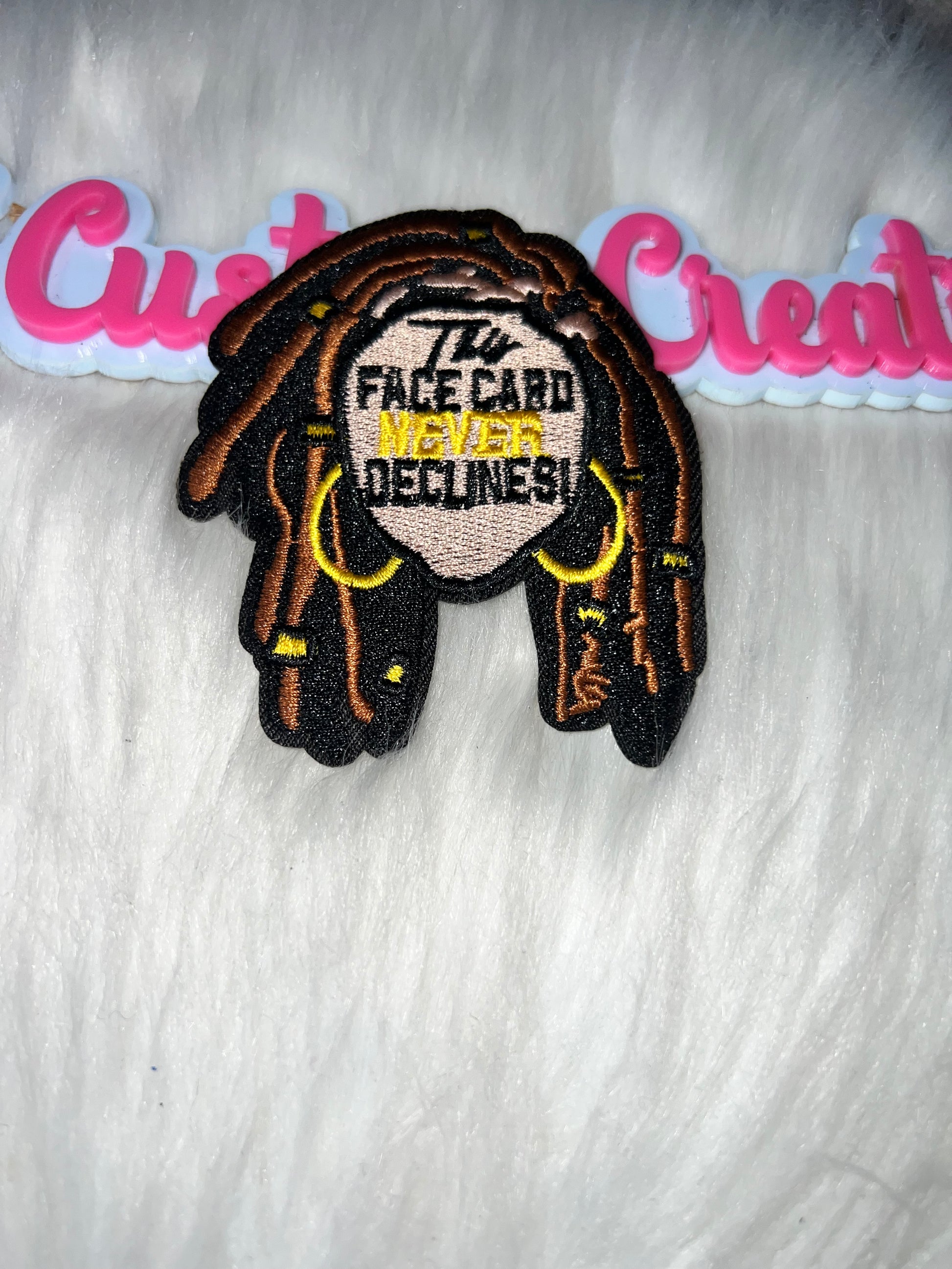 Product Name: “The Face Card Never Declines” Iron-On Patch